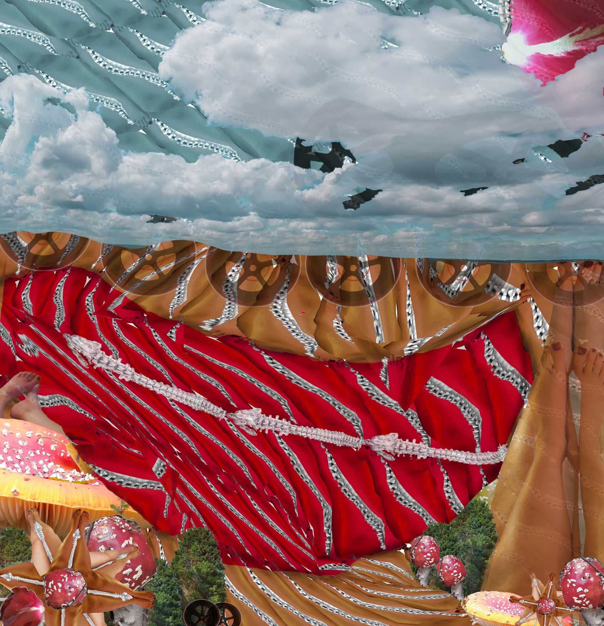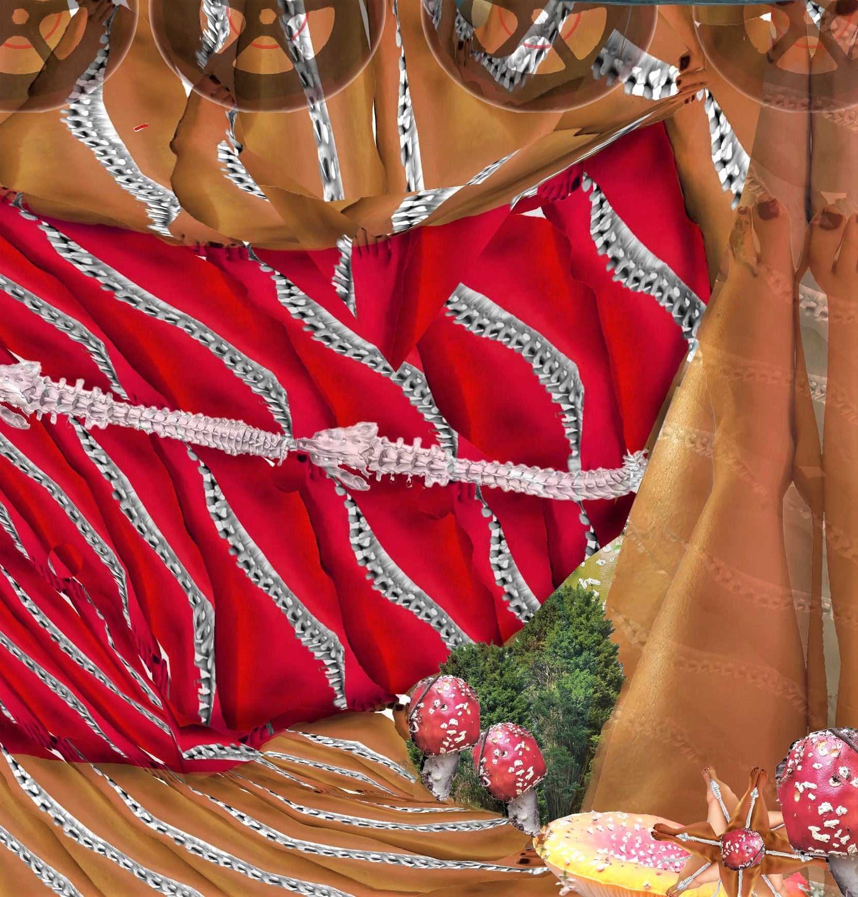 These collages are compiled from manipulated photographs I have taken with my phone and show the things I can’t easily access and have to be fought for through layers of need and new priority. They preference spines, legs and medication, symbolised by toadstools with yew trees representing mortality; all veiling and constraining, with a degree of humour, the nature I am desperate to connect with.